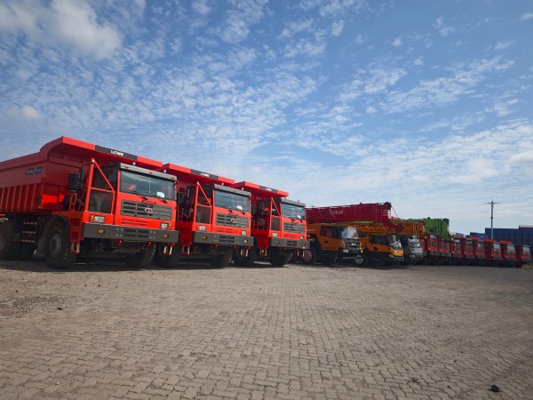 The goods for this shipment are large mining engineering trucks (including multiple red dump trucks as shown in the image below).